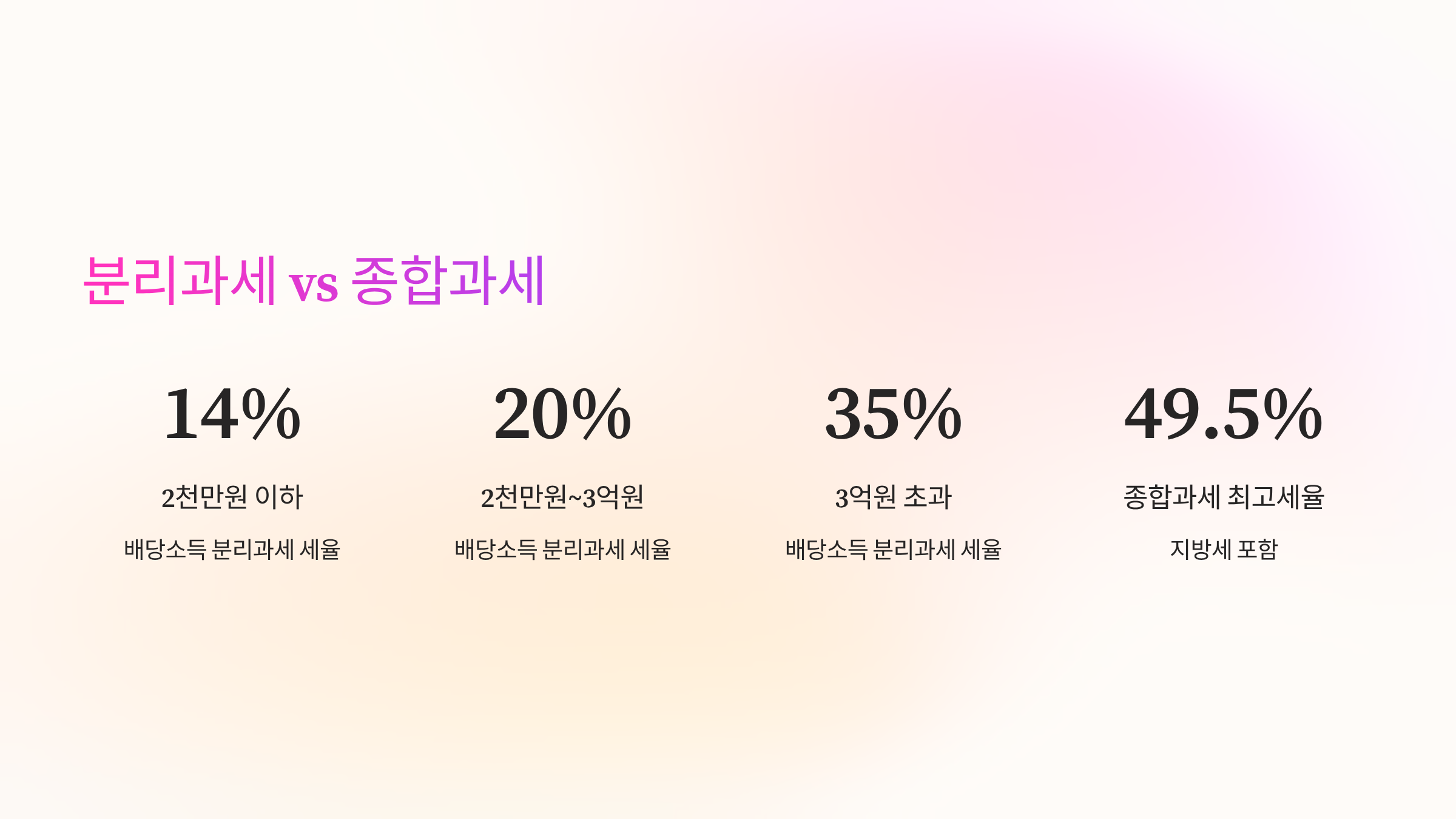이번 개편안의 핵심은 배당소득 분리과세입니다. 이는 배당소득을 다른 종합소득(근로소득, 사업소득 등)과 합산하지 않고, 별도의 세율로 과세하는 제도입니다. 기존에는 연간 배당소득이 2,000만 원을 넘으면 다른 금융소득과 합산하여 최고 49.5%(지방세 포함)의 높은 세율을 적용하는 금융소득종합과세 대상이 되었습니다.