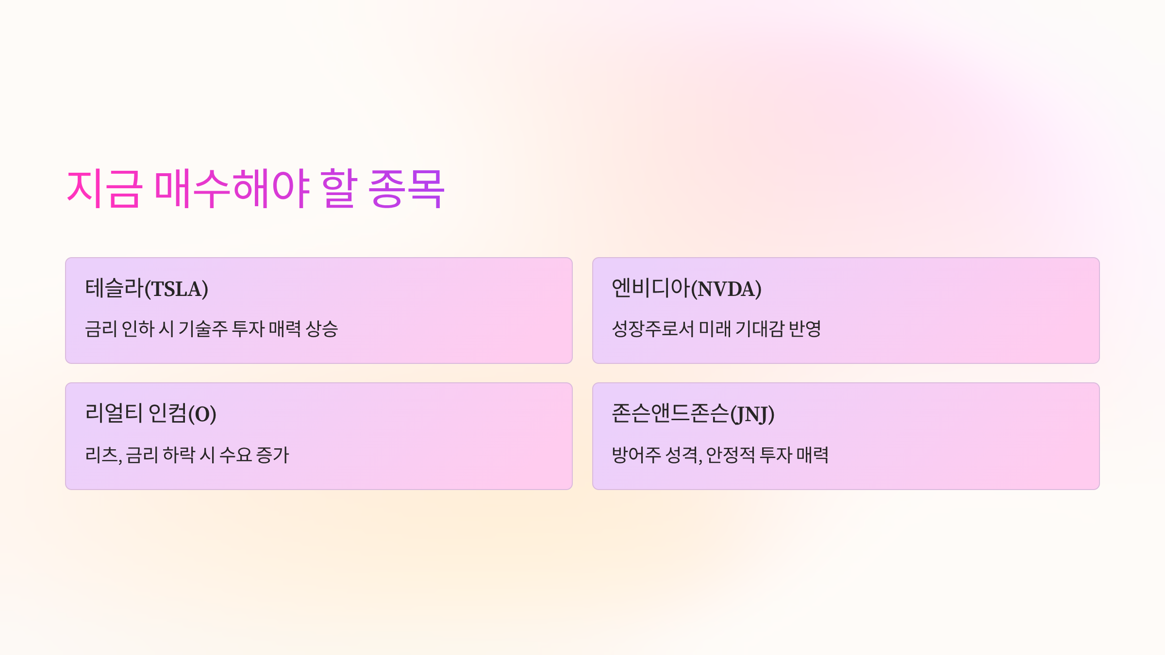 - 부동산 관련주: 리얼티 인컴(O) 같은 리츠(REITs)나 주택 건설 관련주는 금리 하락 시 대출 비용이 줄어들어 수요가 증가하며 실적이 개선될 가능성이 높습니다.