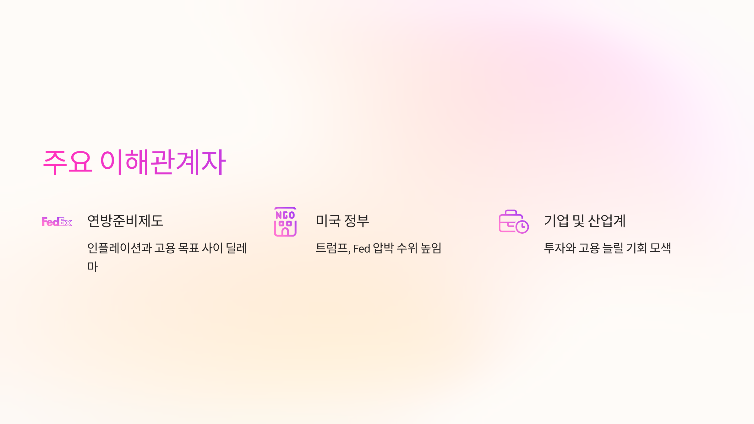 - 미국 정부 및 행정부: 트럼프 대통령은 고용 둔화를 빌미로 Fed에 대한 압박 수위를 높이고 있습니다. 정부효율부(DOGE)를 통한 정부 고용 감축은 그의 정책 기조를 보여줍니다.