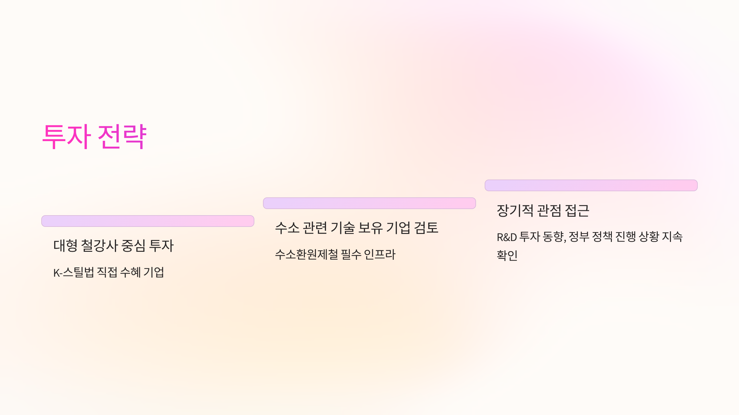 - 철강 기업 (포스코, 현대제철 등): 중국산 저가 공세, 고율 관세, 탄소 규제 등 당면한 위기를 극복하고, 정부 지원을 통해 미래 기술(수소환원제철) 확보에 성공하는 것을 목표로 합니다. 특히, 담합 예외 조항을 통해 공급 과잉 문제를 해결하고 수익성을 개선하는 것에 큰 기대를 걸고 있습니다. 리스크는 조 단위의 막대한 투자금이 필요한 수소환원제철 기술 개발에 실패하거나, 정부 지원이 예상보다 미흡할 경우입니다.