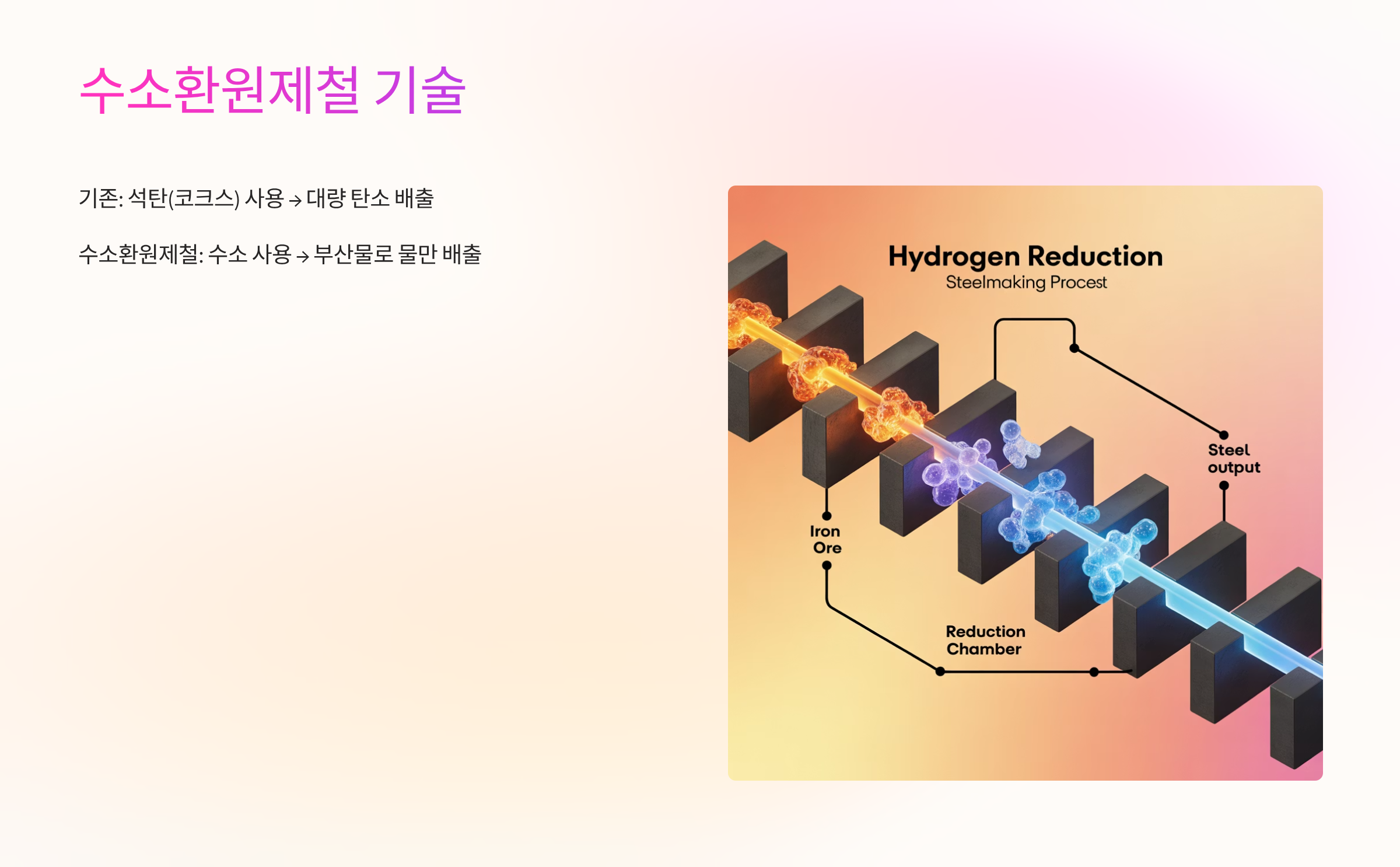 기존의 고로(용광로) 방식은 철광석을 녹일 때 석탄(코크스)을 사용하기 때문에 필연적으로 대량의 탄소 배출이 발생합니다. 반면, 수소환원제철은 석탄 대신 수소를 환원제로 사용합니다. 철광석과 수소가 반응하여 철을 만들고, 부산물로 물(H2O)만 배출되기 때문에 탄소 배출이 '0'에 가까워집니다. 이는 기존 기술과 비교했을 때 환경적인 측면에서 혁신적인 진보입니다.