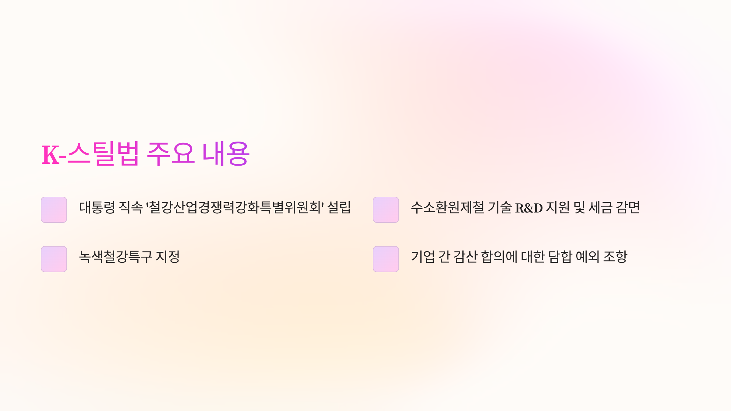 K-스틸법은 대한민국 철강 산업의 위기를 극복하고 미래를 준비하는 중요한 전환점입니다. 법안이 통과되면 수소환원제철 기술 확보와 구조조정을 통해 산업 전반의 경쟁력이 강화될 것입니다.