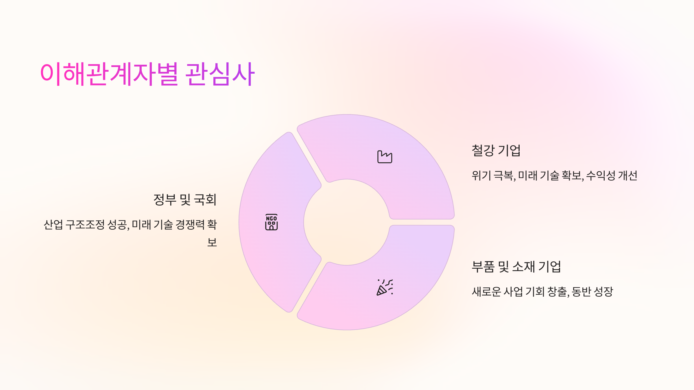 - 정부 및 국회: 철강 산업의 위기를 극복하고 국가 경제의 든든한 축을 유지하는 데 관심이 있습니다. K-스틸법 통과를 통해 산업 구조조정을 성공적으로 이끌고, 미래 기술 경쟁력을 확보하여 지속 가능한 성장을 목표로 하고 있습니다. 리스크는 법안 통과 이후에도 정책 실행이 더딜 경우, 산업 경쟁력 약화가 지속될 수 있다는 점입니다.