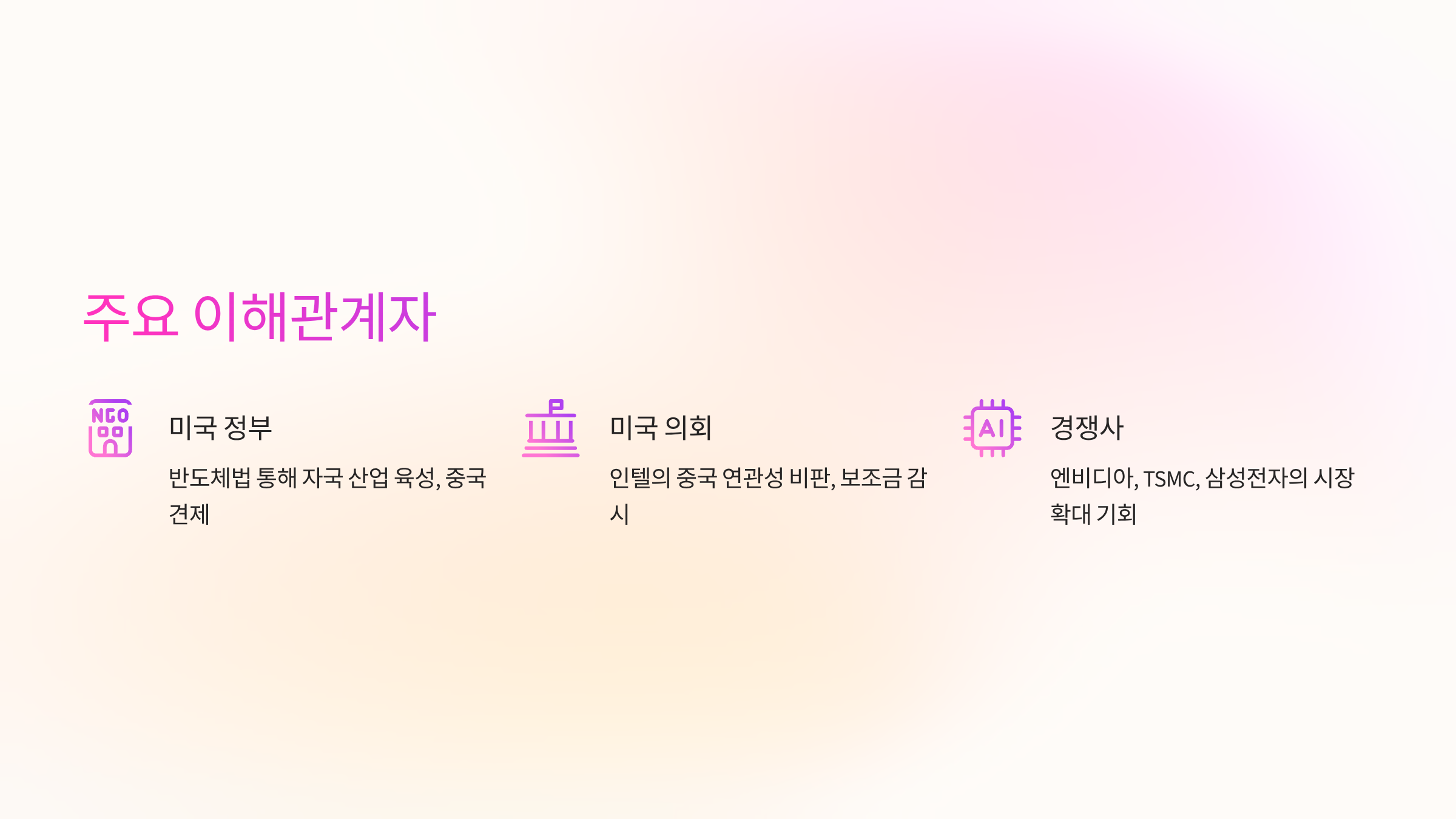 - 미국 정부: 반도체법을 통해 자국 내 반도체 산업을 육성하고, 기술 패권에서 중국에 우위를 점하는 것을 목표로 합니다.