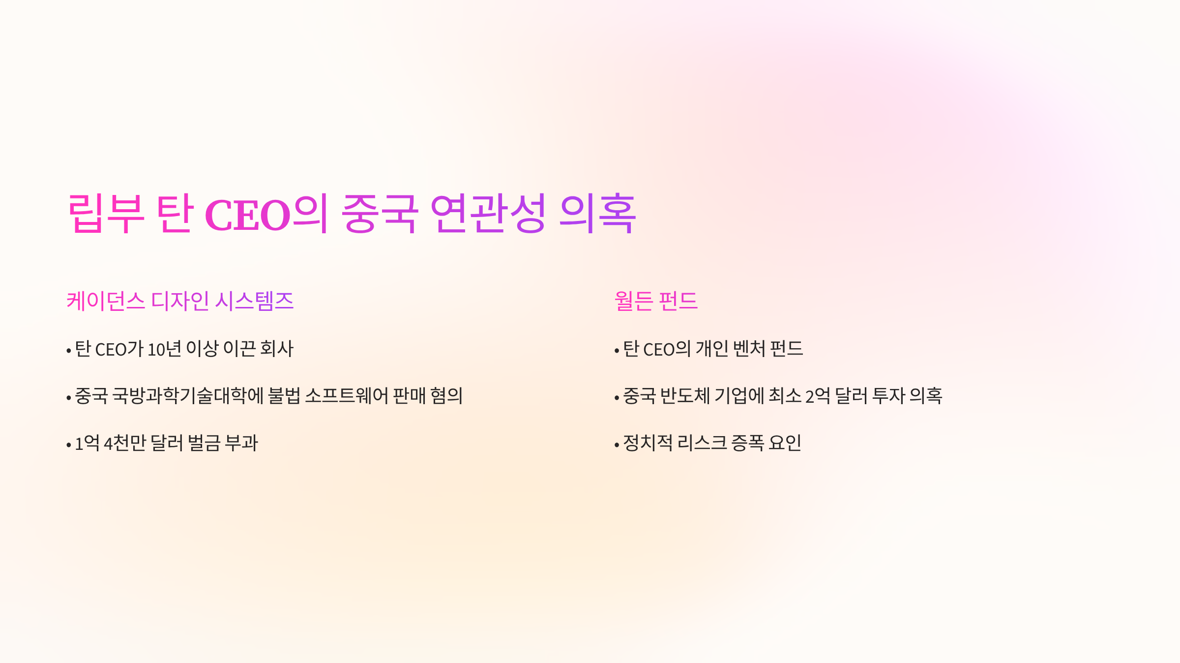- 월든(Walden): 탄 CEO가 개인적으로 운영하는 벤처 펀드로, 중국 반도체 기업에 최소 2억 달러를 투자했다는 의혹을 받고 있습니다. '월든' 펀드의 중국 투자 이력은 탄 CEO의 정치적 리스크를 증폭시키는 핵심 요인입니다.