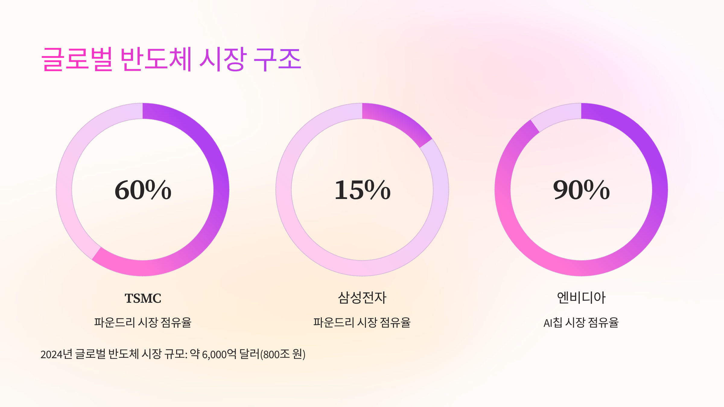 - 시장 구조: 반도체 시장은 크게 메모리 반도체(삼성전자, SK하이닉스), 시스템 반도체(엔비디아, 퀄컴), 그리고 파운드리(TSMC, 삼성전자)로 나뉩니다. 현재 파운드리 시장은 TSMC가 약 60%, 삼성전자가 약 15%의 점유율을 차지하며 양강 구도를 형성하고 있습니다.