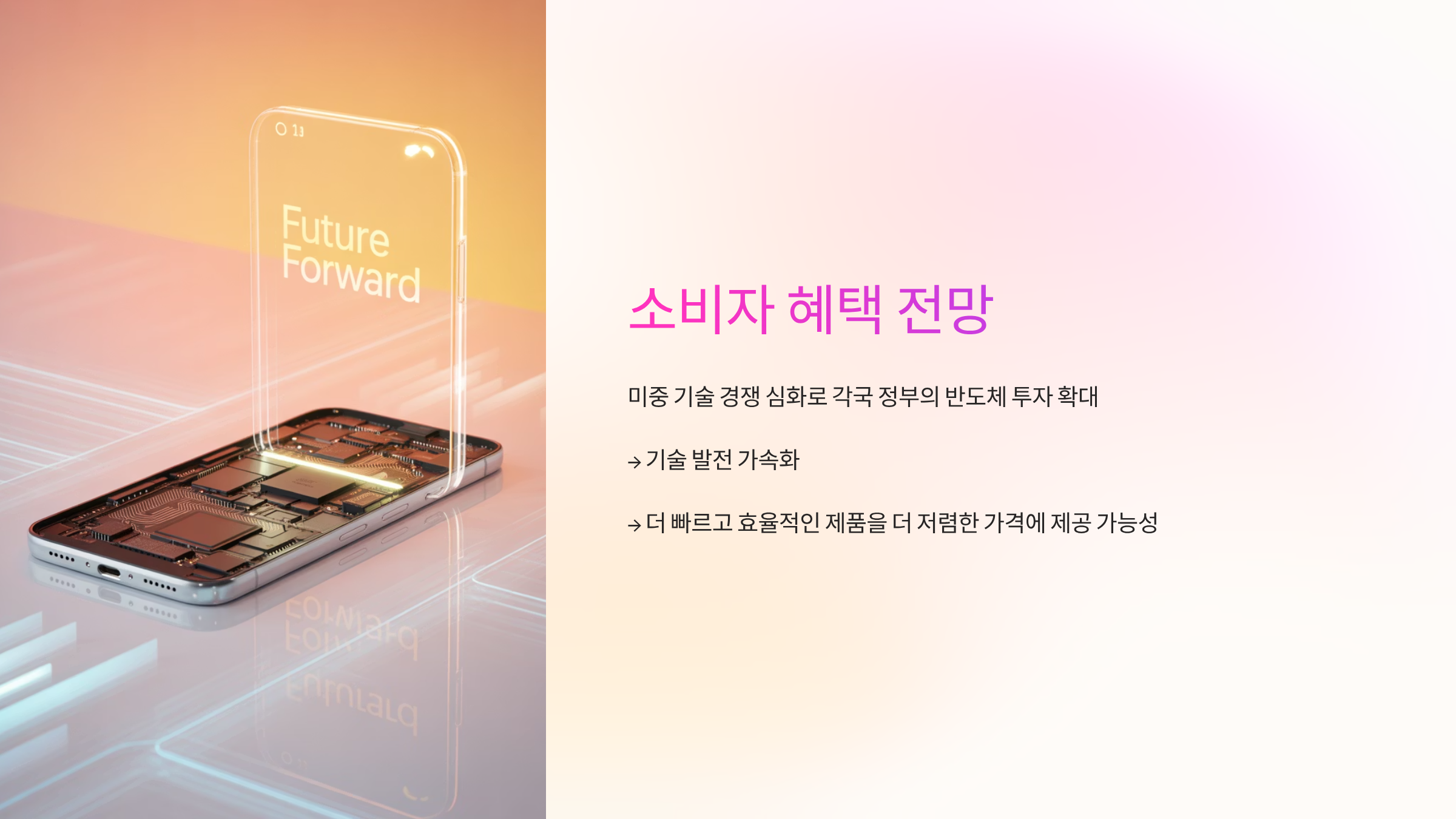 이번 사태가 직접적으로 소비자에게 미치는 영향은 제한적일 수 있지만, 장기적으로는 긍정적인 변화를 기대할 수 있습니다. 미국과 중국의 기술 경쟁이 심화되면서 각국의 정부가 반도체 산업에 막대한 투자를 이어가고, 이는 곧 기술 발전으로 이어져 더 빠르고 효율적인 제품을 더 저렴한 가격에 만나볼 수 있게 될 가능성이 있습니다.
