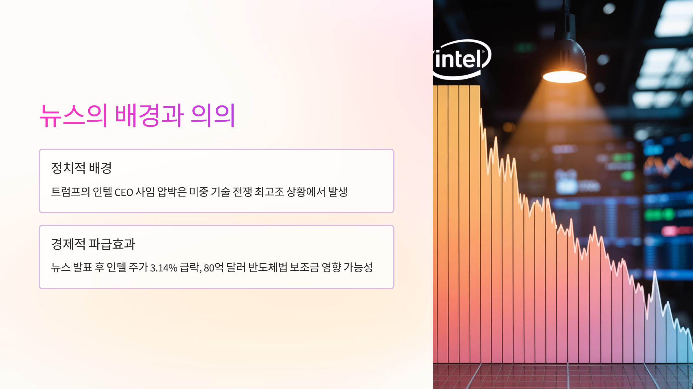 이번 뉴스는 미중 기술 전쟁이 최고조에 달한 상황에서 발생했습니다. 인텔의 립부 탄 CEO가 과거 중국과 연관된 투자 및 사업을 진행했다는 의혹이 정치적 리스크로 부상한 것이 핵심 배경입니다. 이는 단순히 한 기업의 경영자 교체 문제를 넘어, 미국 정부가 자국 반도체 산업의 '순수성'을 얼마나 중요하게 여기는지 보여주는 상징적인 사건입니다.