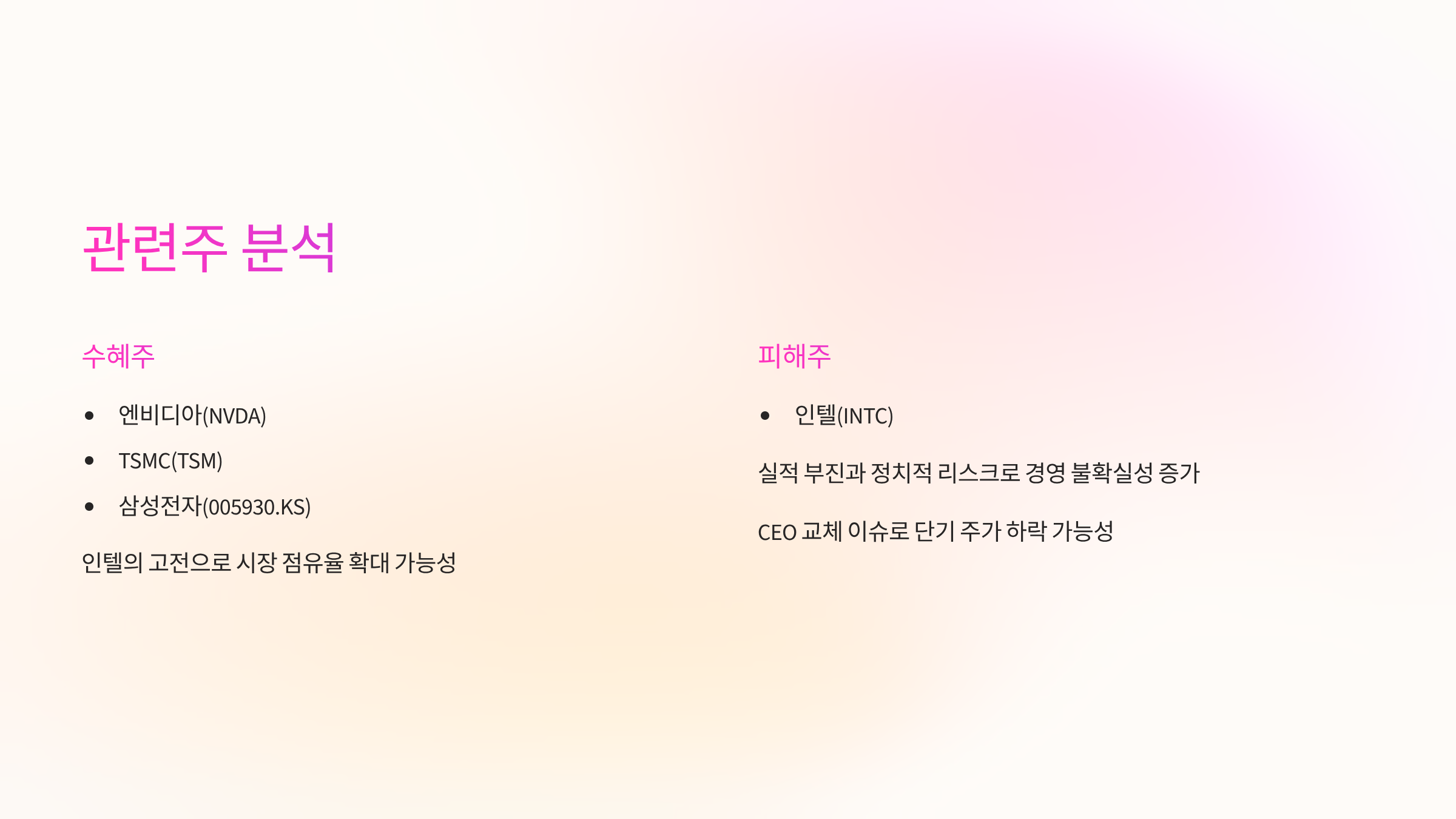 - 수혜주: 엔비디아(NVDA), TSMC(TSM), 삼성전자(005930.KS)