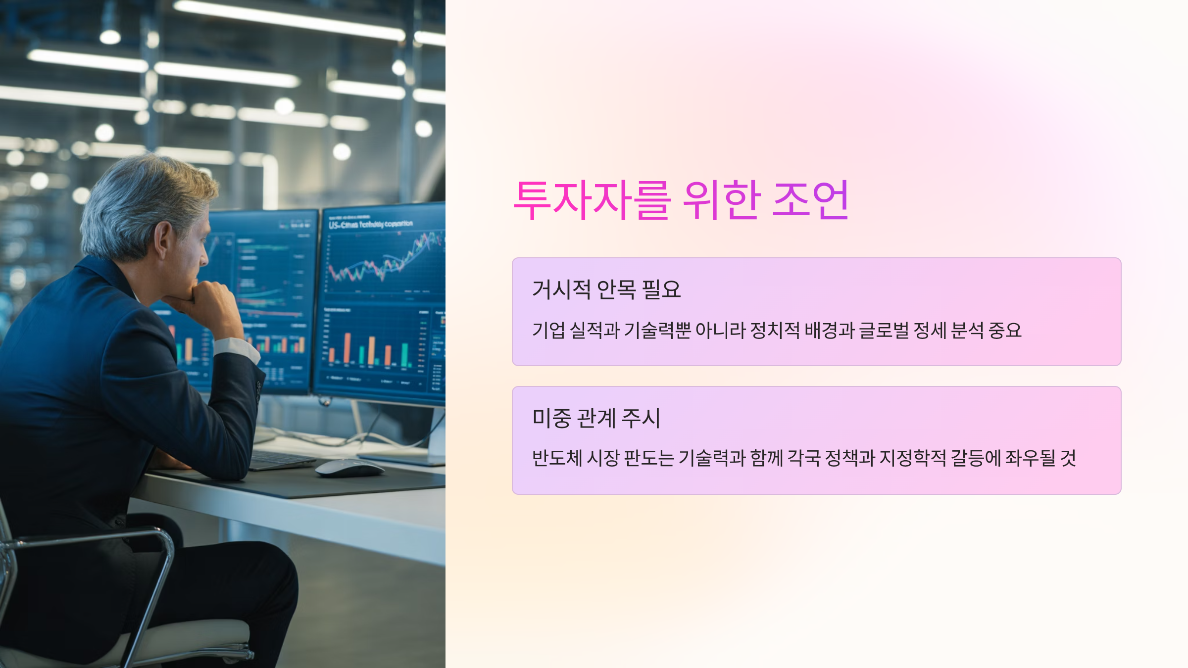 이번 인텔 사태는 미중 기술 전쟁이라는 거대한 흐름 속에서 기업의 경영이 얼마나 정치적 리스크에 취약해질 수 있는지를 여실히 보여줍니다. 앞으로 반도체 시장의 판도는 단순히 기술력뿐만 아니라, 각국의 정책과 지정학적 갈등에 의해 크게 좌우될 것입니다. 따라서 투자자들은 기업의 실적과 기술력뿐만 아니라, 정치적 배경과 글로벌 정세를 꼼꼼히 분석하는 '거시적인 안목'을 가져야 합니다. 관련 뉴스를 꾸준히 구독하고, 미중 관계의 변화를 예의주시하며 투자 전략을 세우시길 바랍니다.
