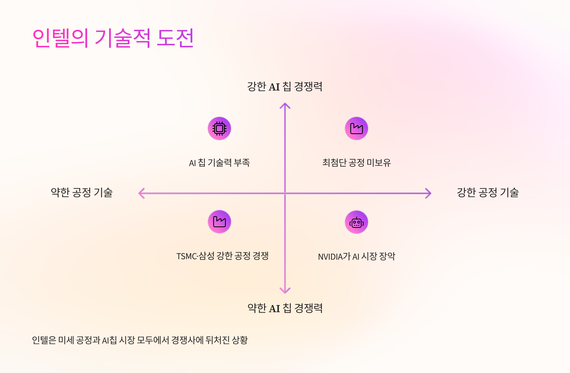 인텔은 오랫동안 종합 반도체 회사(IDM)로서 설계부터 생산까지 모든 과정을 자체적으로 해결해왔습니다. 하지만 최근 파운드리(반도체 위탁 생산) 분야에서는 TSMC와 삼성전자에 밀리고, AI칩 시장에서는 엔비디아에 존재감이 미미하다는 평가를 받고 있습니다.