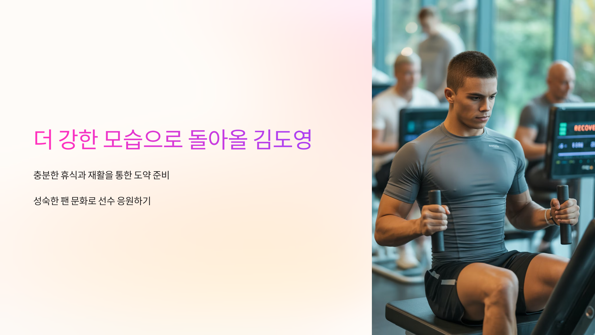 결론적으로, 김도영 선수의 부상은 안타까운 소식이지만, 이를 계기로 우리 모두는 선수의 건강이 얼마나 중요한지 다시 한번 깨달을 수 있었습니다. 이번 시즌은 아쉽게 마무리되지만, 김도영 선수가 충분한 휴식과 재활을 통해 더 강한 모습으로 돌아올 것이라 믿습니다. 그의 복귀를 기다리며, 우리는 선수에게 '괜찮다'고 말해줄 수 있는 성숙한 팬 문화를 만들어 나가야 할 것입니다.