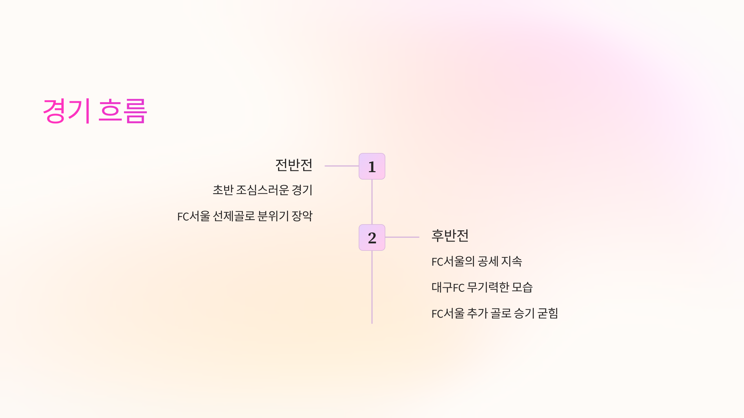 - 후반전: 후반에도 FC서울의 공세는 이어졌습니다. 탄탄한 수비와 날카로운 역습으로 대구FC의 빈틈을 노렸고, 연이어 추가 골을 성공시키며 승기를 굳혔습니다. 반면, 대구FC는 바르셀로나와의 경기를 치른 후유증 때문인지 전체적으로 무기력한 모습을 보이며 유효 슈팅을 거의 기록하지 못했습니다.