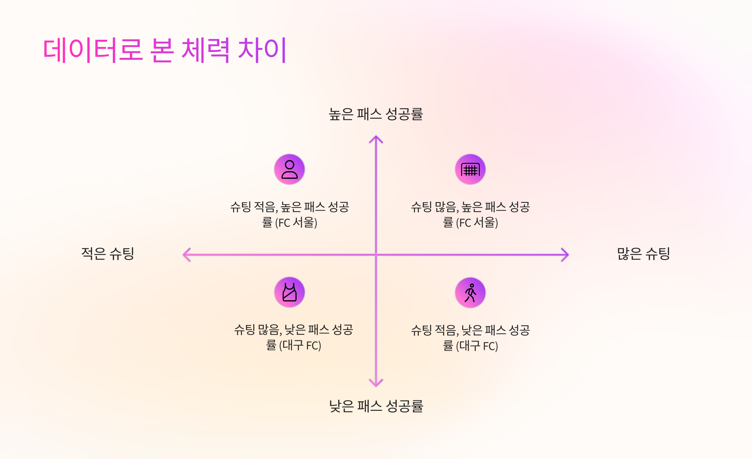 위 표에서 볼 수 있듯이, FC서울은 대구FC보다 훨씬 더 많은 슈팅과 높은 패스 성공률을 기록했습니다. 이는 선수들이 체력적인 여유 속에서 더 정확하고 과감한 플레이를 할 수 있었다는 것을 의미합니다. 또한 팀 전체 활동량에서도 FC서울이 약 10km 가까이 더 뛰면서 체력적인 우위를 점했음을 알 수 있습니다. 대구FC 선수들은 전반전 중반 이후부터 체력이 급격히 떨어지는 모습을 보였고, 이는 결국 경기력 저하로 이어졌습니다.