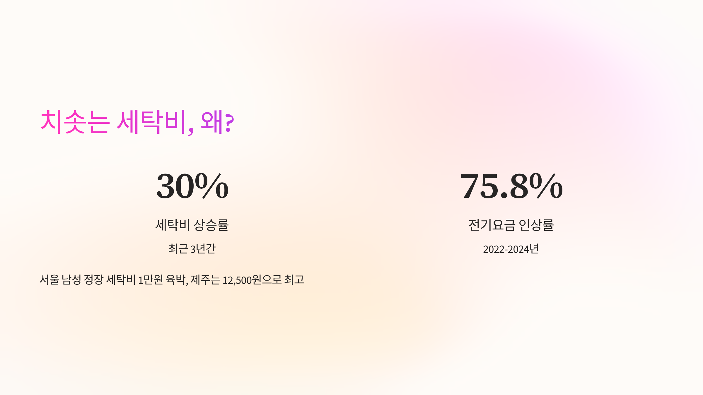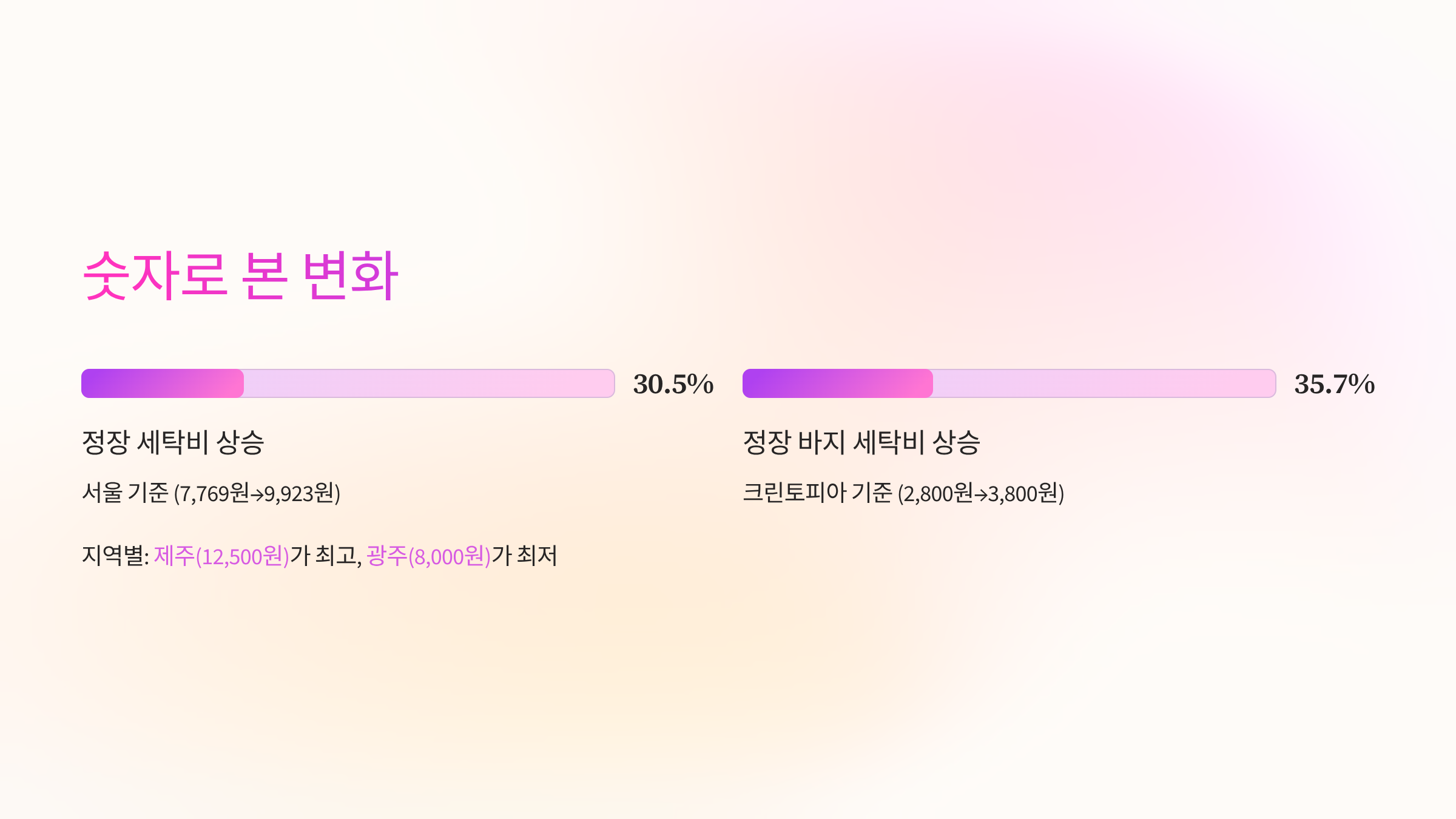 - 프랜차이즈 가격 인상: 크린토피아의 경우, 셔츠 1벌 세탁 가격이 2022년 1,500원에서 2025년 1,900원으로 26.6% 올랐고, 정장 바지는 2,800원에서 3,800원으로 35.7%나 급등했습니다.