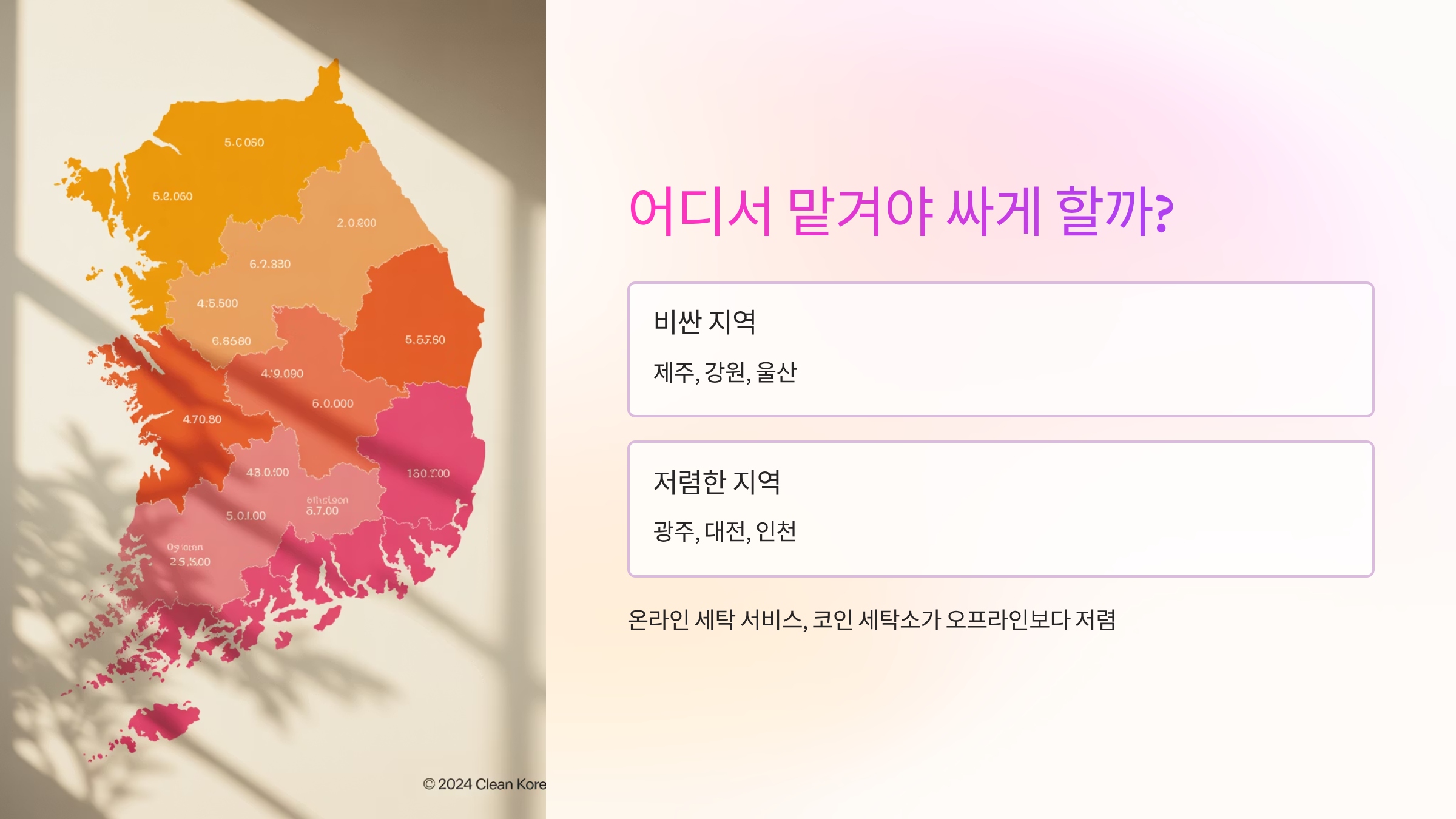 - 지역별 격차: 제주와 강원, 울산 등은 세탁비가 비싸고, 광주와 대전, 인천 등은 저렴합니다. 이는 지역별 물가 수준과 경쟁 구도에 따른 것으로, 소비자들은 거주 지역의 평균 가격을 확인하고 합리적인 선택을 할 필요가 있습니다.