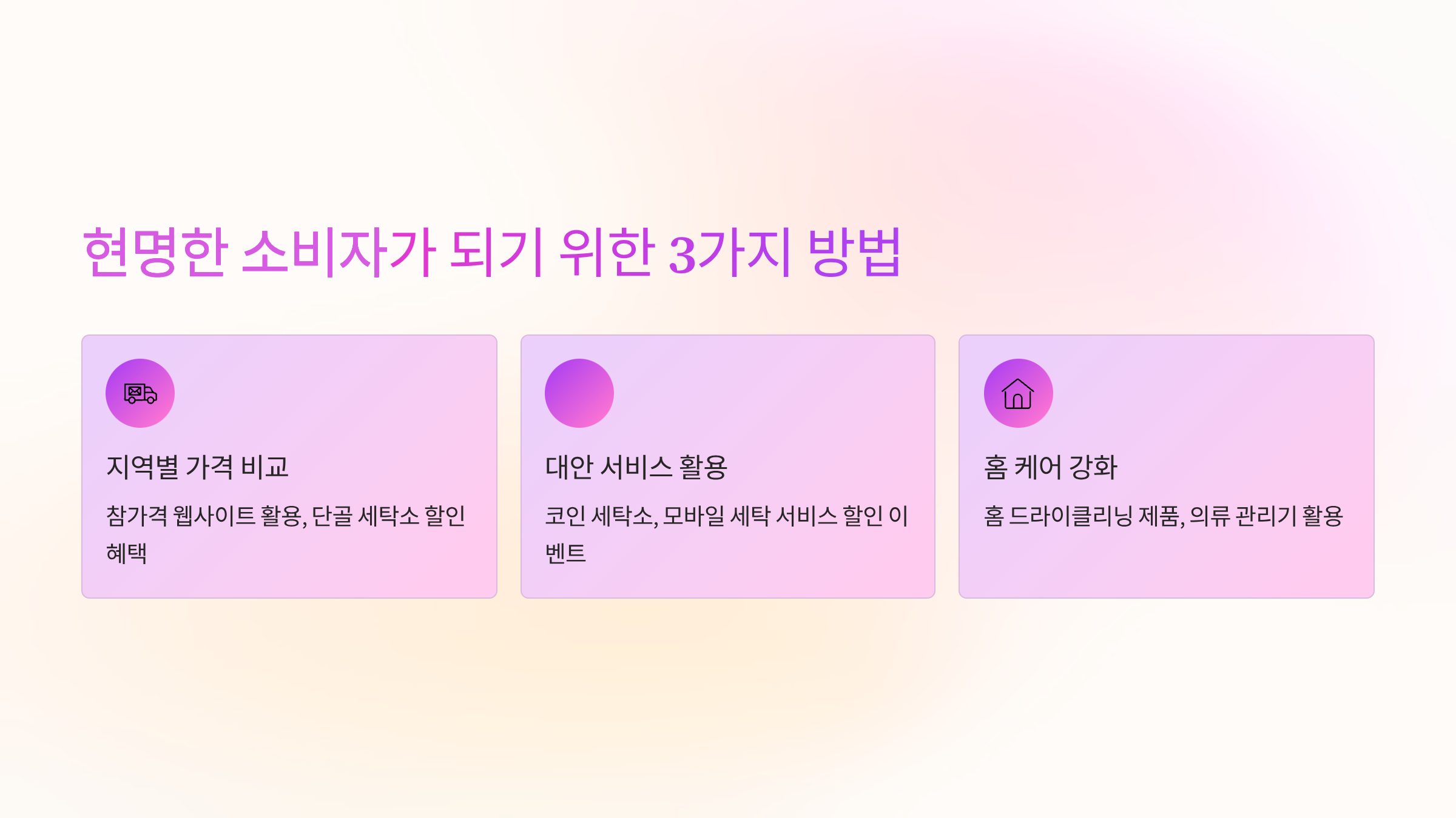 - 지역별 가격을 비교하고, 단골 매장을 활용하라: 한국소비자원 '참가격' 웹사이트 등을 통해 거주 지역의 평균 세탁비를 확인하세요. 또한, 단골 세탁소에서 제공하는 할인 쿠폰이나 멤버십 혜택을 적극적으로 활용하여 비용을 절약할 수 있습니다.