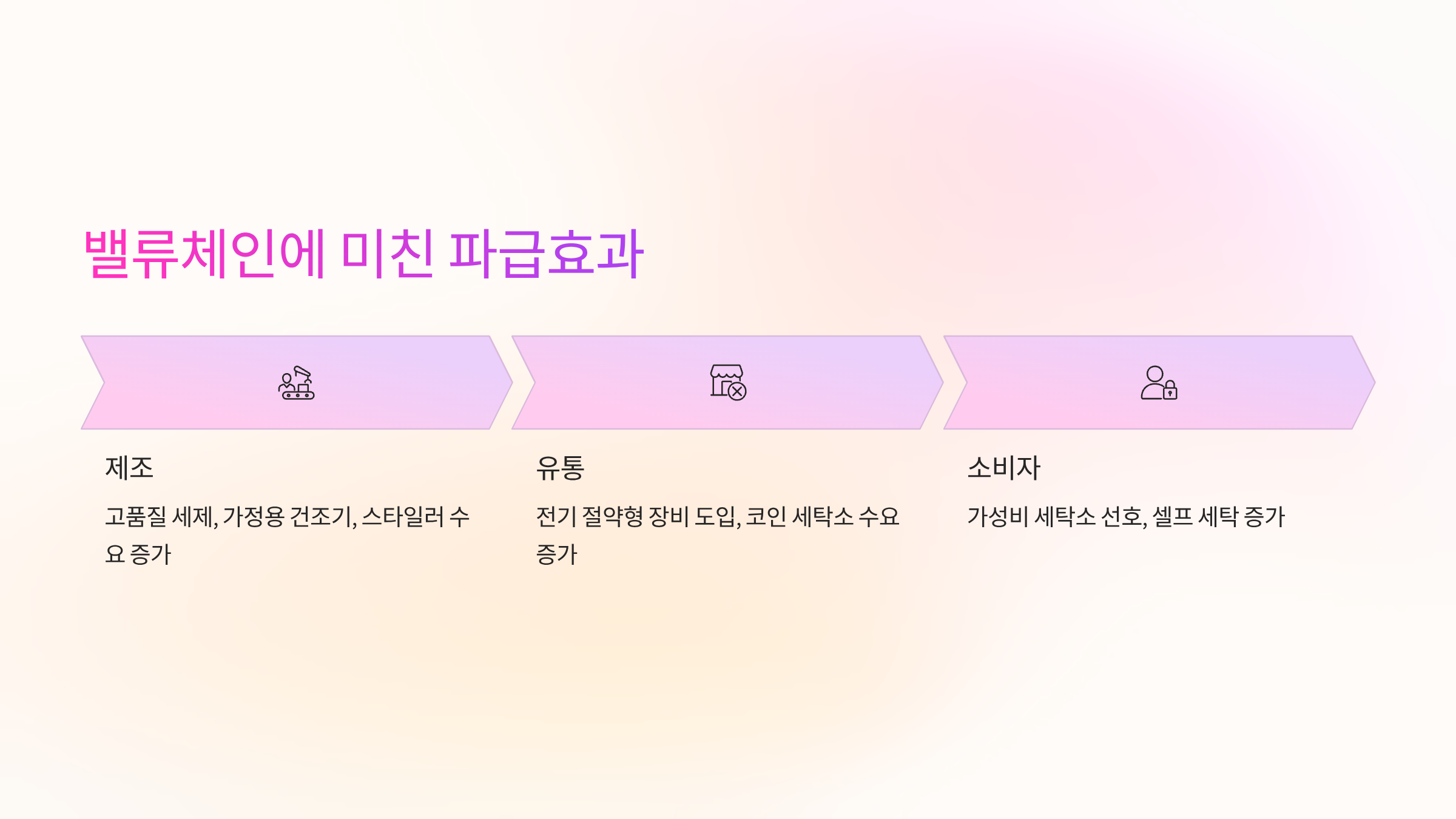 - 소비자: 세탁비 지출에 부담을 느끼는 소비자는 가성비 좋은 세탁소를 찾아다니거나, 셀프 세탁, 또는 세탁 빈도를 줄이는 방향으로 소비 패턴을 변화시킬 수 있습니다.