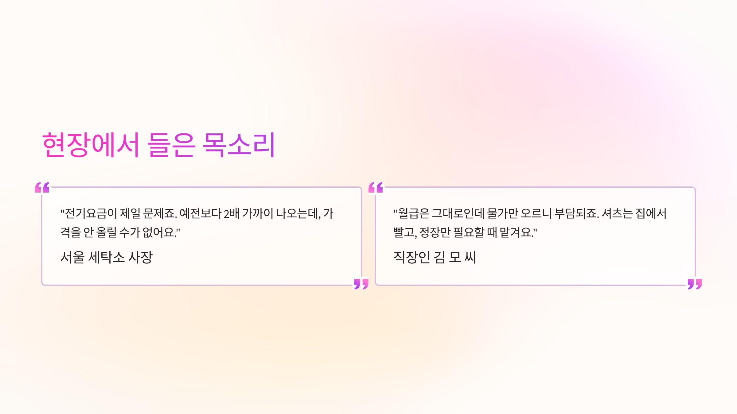 "아무래도 전기요금이 제일 문제죠. 예전보다 2배 가까이 나오는데, 가격을 안 올릴 수가 없어요." (서울 세탁소 사장) "솔직히 월급은 그대로인데 물가만 오르니 부담되죠. 이제는 셔츠는 집에서 빨고, 정장만 정말 필요할 때 드라이클리닝 맡겨요." (직장인 김 모 씨)