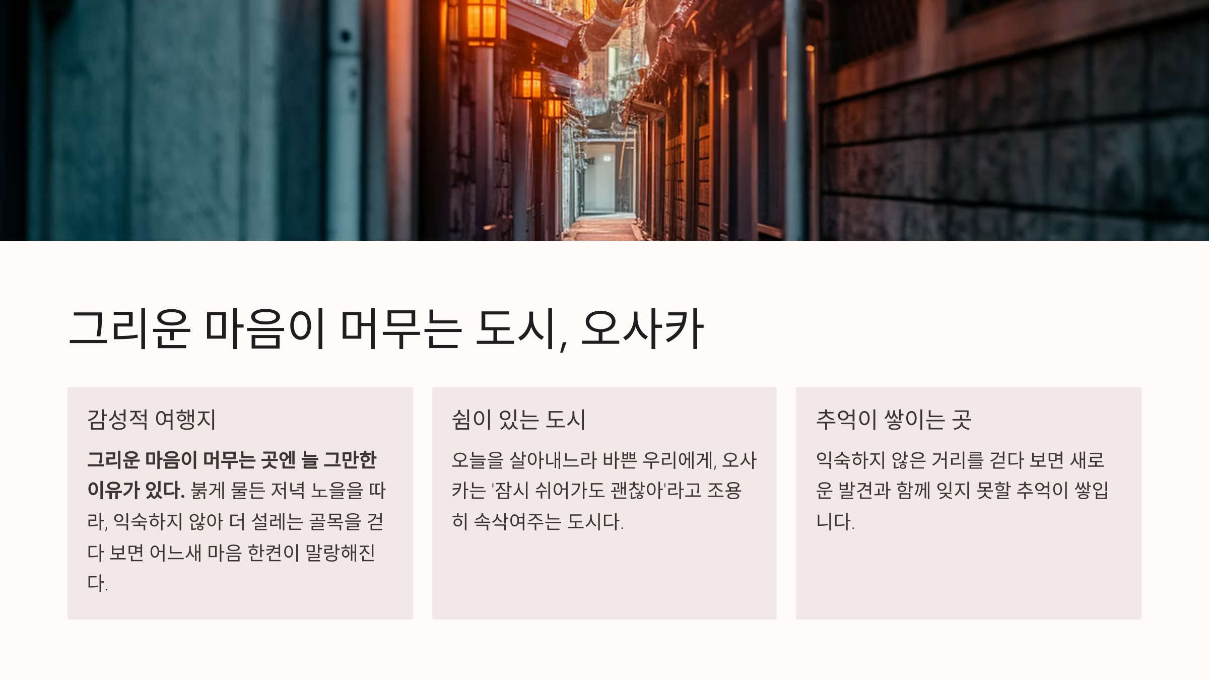 붉게 물든 저녁 노을을 따라, 익숙하지 않아 더 설레는 골목을 걷다 보면 어느새 마음 한켠이 말랑해진다. 오늘을 살아내느라 바쁜 우리에게, 오사카는 ‘잠시 쉬어가도 괜찮아’라고 조용히 속삭여주는 도시다.