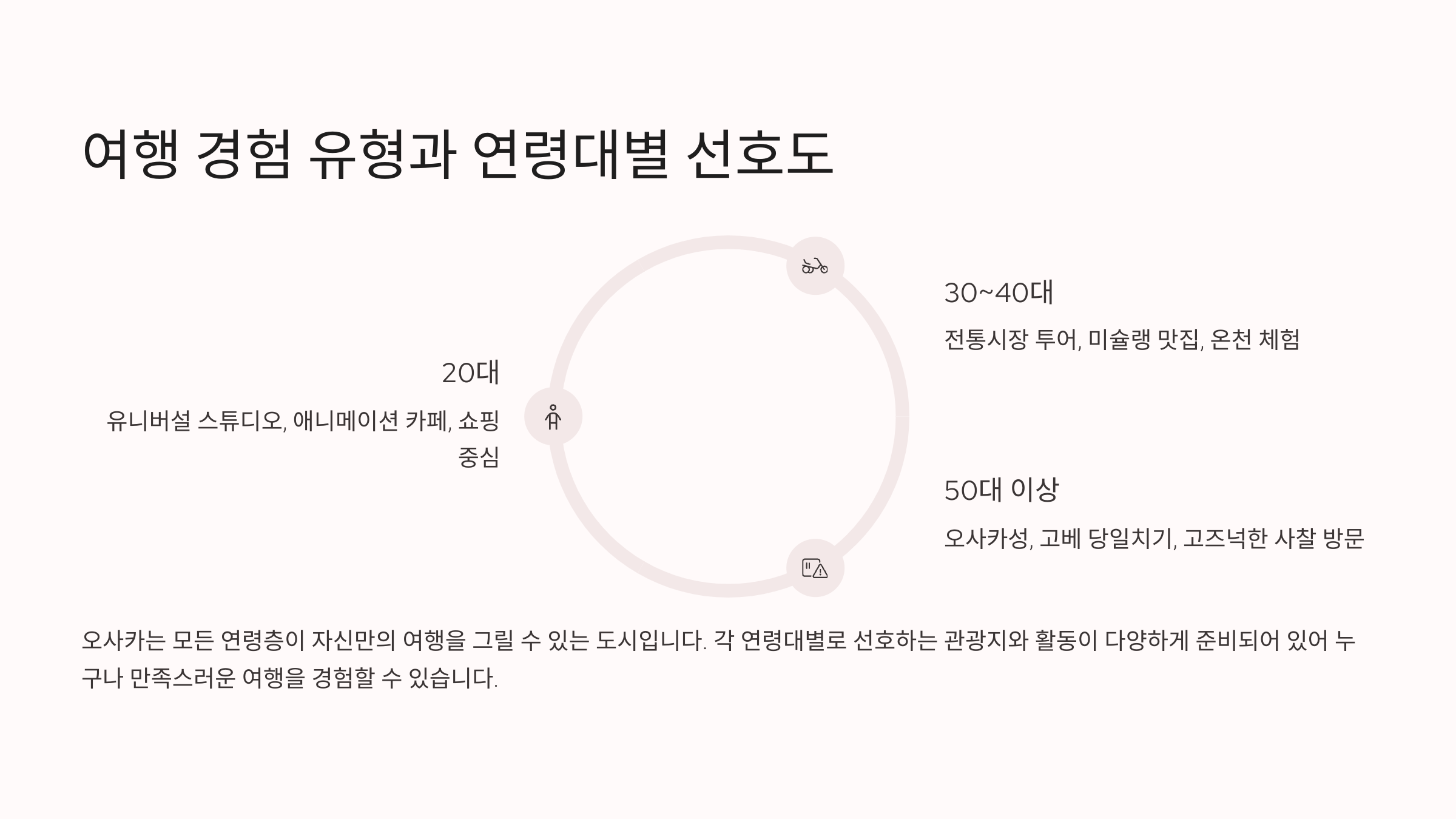 - 50대 이상: 오사카성, 고베 당일치기, 고즈넉한 사찰 방문